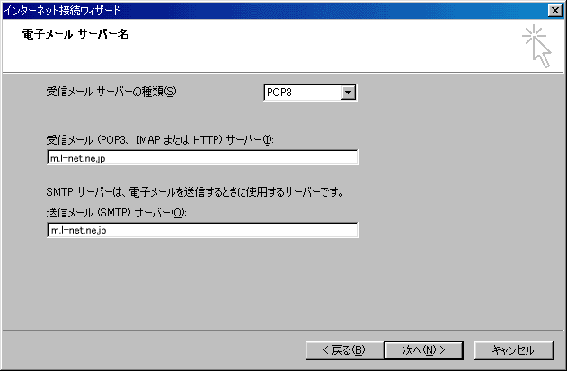 | 13.「電子メールサーバー名」の画面が表示されますので下記のように設定してください。 ●受信メールサーバーの種類:「POP3」 ●受信メール(POP3、IMAPまたはHTTP)サーバー:「m.l-net.ne.jp」 ●送信メール(SMTP)サーバー:「m.l-net.ne.jp」 ※旧コース(A・B・VIP)の場合は下記の通りとなります。 ●受信メールサーバーの種類:「POP3」 ●受信メール(POP3、IMAPまたはHTTP)サーバー:「mail.l-net.ne.jp」 ●送信メール(SMTP)サーバー:「mail.l-net.ne.jp」 設定が終わったら「次へ」をクリックしてください。 |